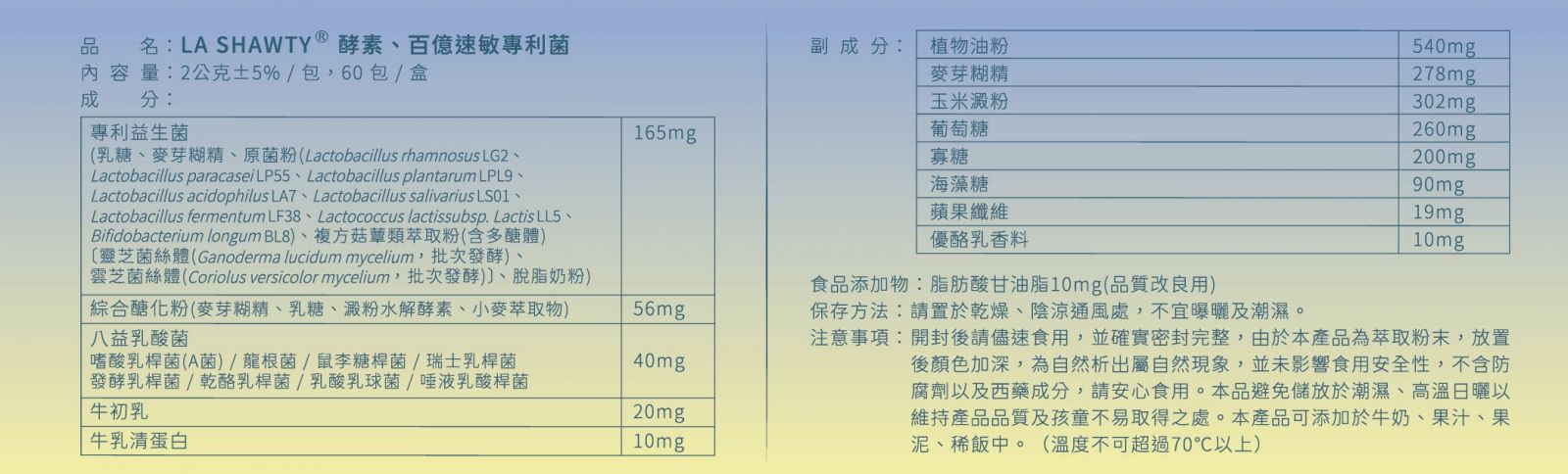 LA SHAWTY 酵素、百億速敏專利菌規格:60包 / 盒 容量:2g ± 5% ![]() ![]() ![]()